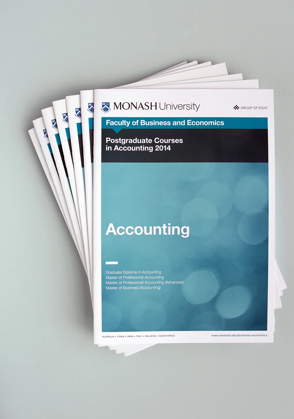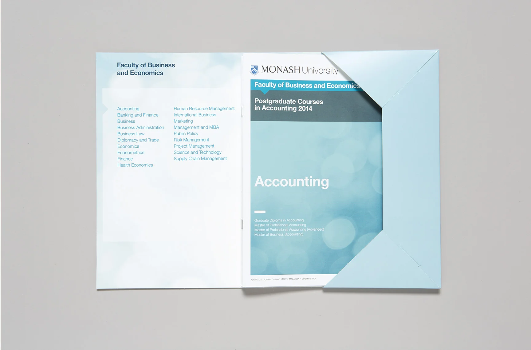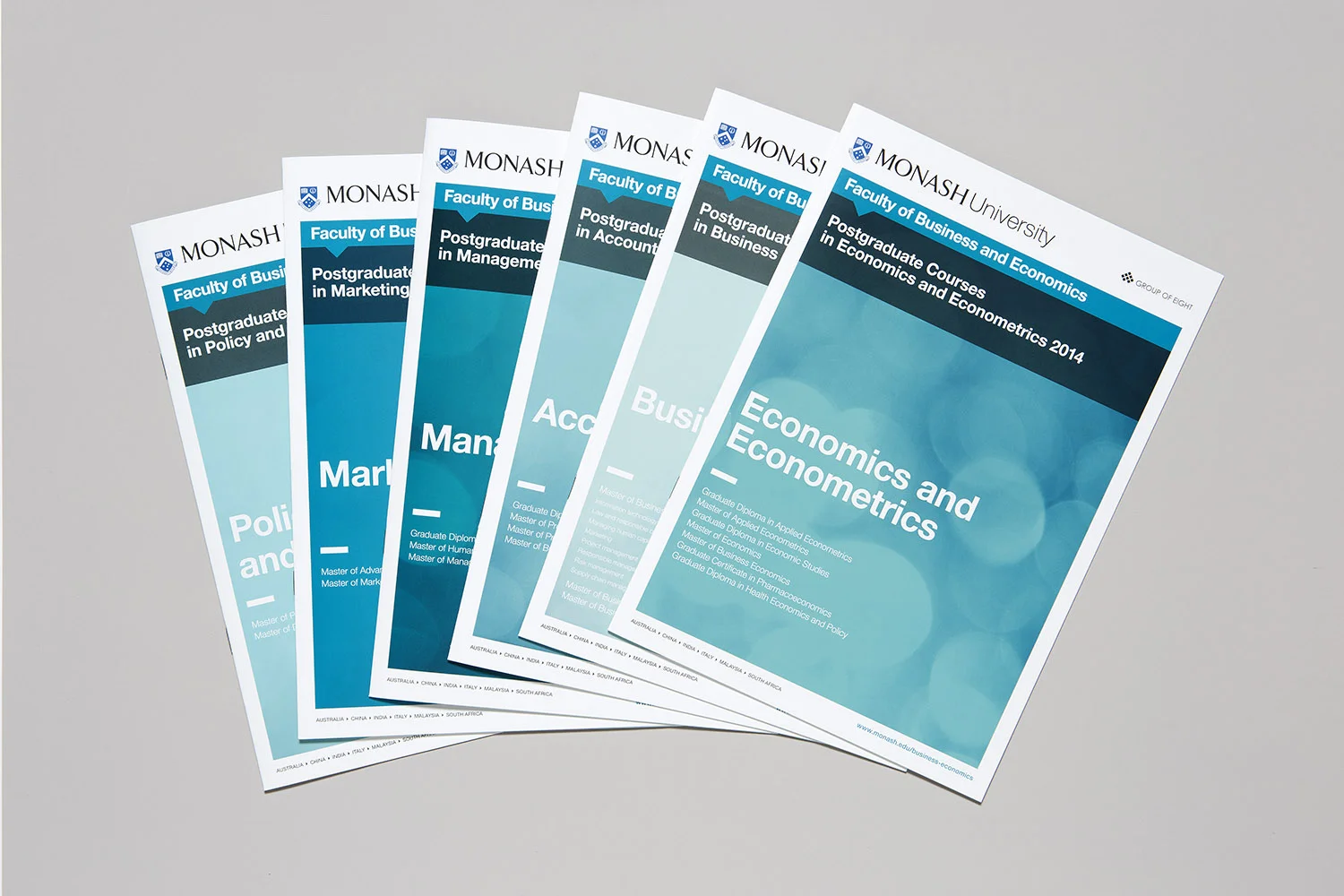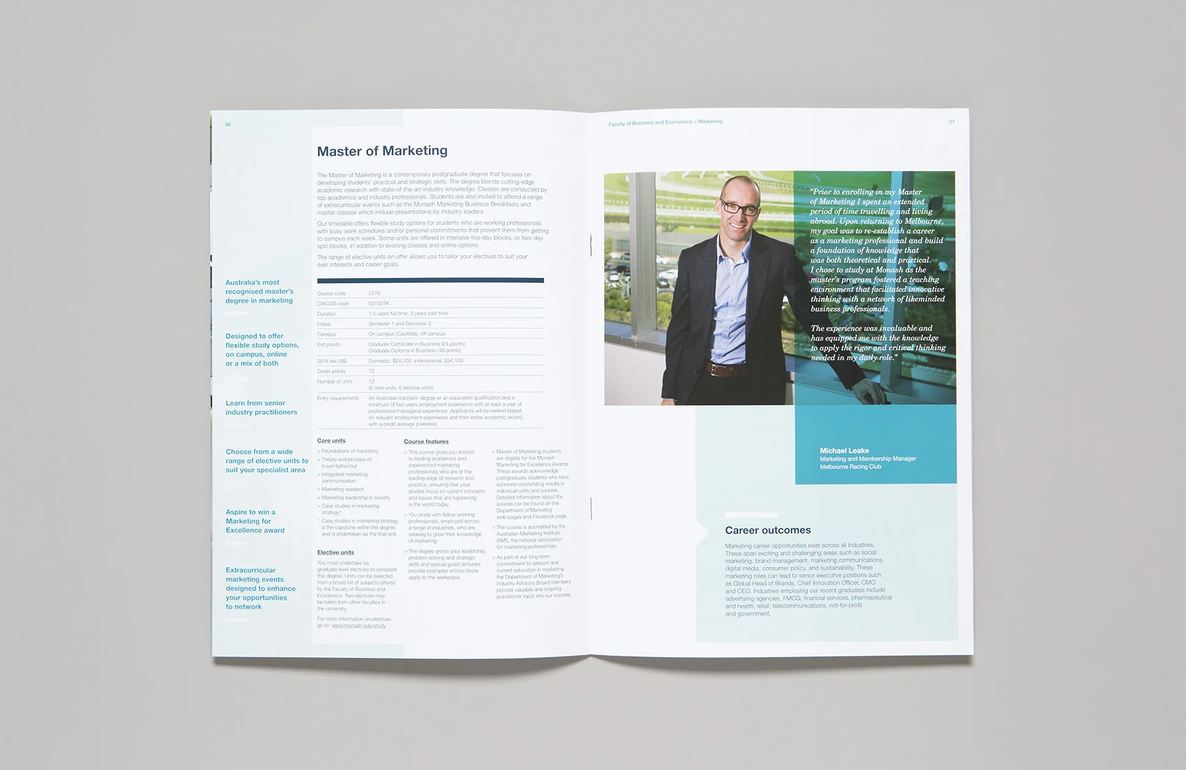 For Monash University, the task was not only to design their new range of course brochures, but also to update the visual language and to elevate their services from the competition. We devised a new concept that tapped into the vast number of university credentials which were previously not utilised in the faculty's communication. At the same time, to separate Monash / Business and Economics from the competition – we took great care in avoiding the clichés usually associated with education publications.